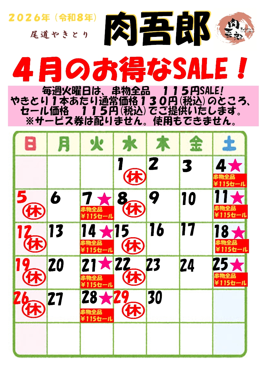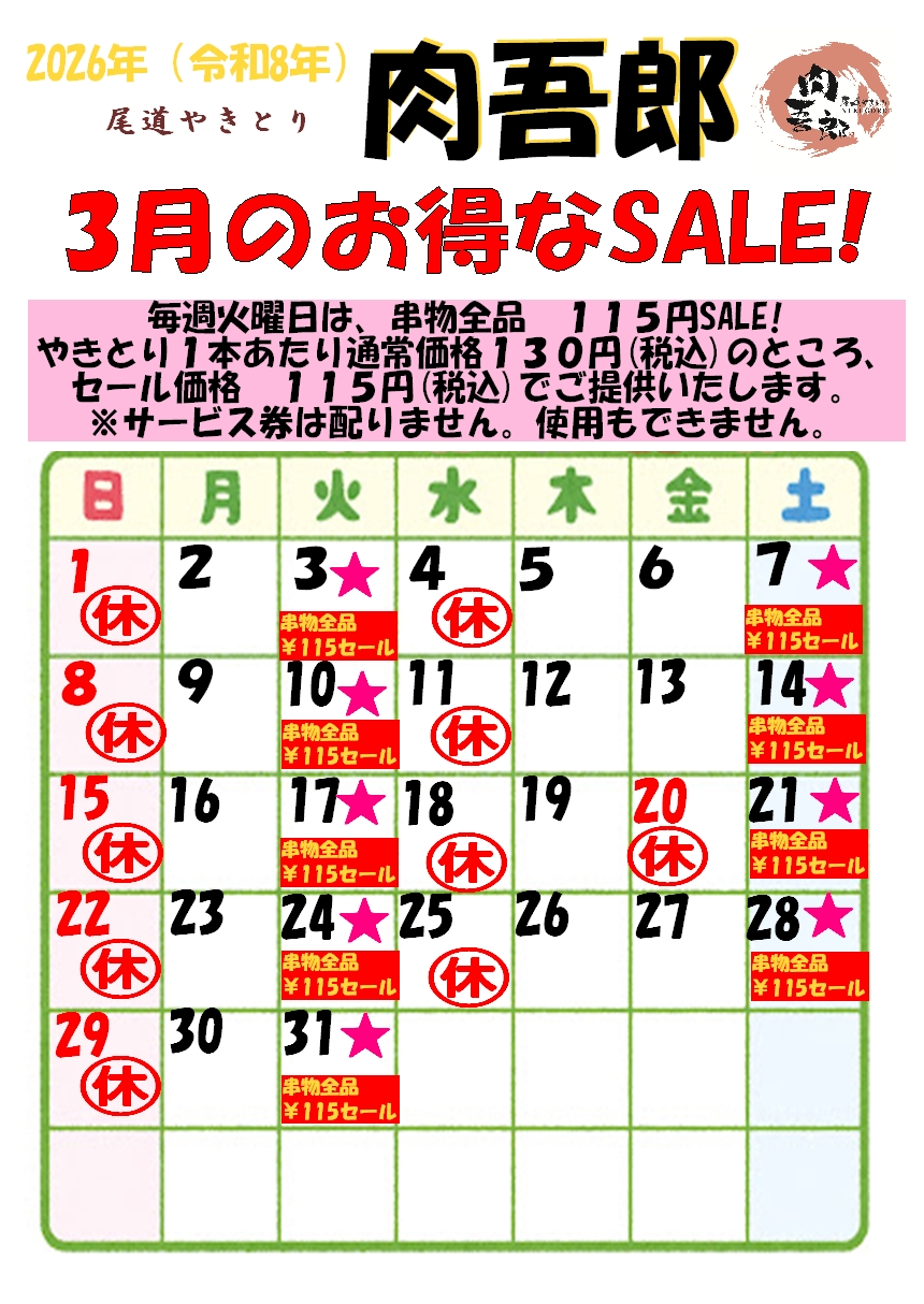 ![]() 商品一覧 店舗案内 立ち飲みメニュー Niku Goro (Kushiya GORO) standing bar menu 2026.3.30 ![]() ![]() 2026.1.26 ![]() 2026.1.22更新 平素からご愛顧いただきありがとうございます。 誠に勝手ではございますが、本日は、臨時休業とさせていただきます。 ご不便をお掛けして申し訳ありません。 2026.1.1更新 新年あけましておめでとうございます。 旧年中は格別のご愛顧を賜り、心から御礼申し上げます。 本年も、皆様に喜んでいただける焼き鳥をお届けできるよう、努めてまいります。 また、日頃の感謝を込めて、休み明けより3日間、全串¥115 新春セールを開催いたします。 ぜひこの機会にご来店ください。 本年の営業は1月8日(木)から再開いたします。 2026年もどうぞよろしくお願い申し上げます。 店主 ![]() 2025.12.28更新 平素からご愛顧いただきありがとうございます。 現在、大変多くのご予約ご注文を頂いており、 生産が追いつかない状況になっております。 そのため、誠に恐縮ではございますが、年内の店舗での販売を休止 させていただきます。 ご来店を予定されていたお客様にはご迷惑おかけし、心よりお詫び申し上げます。 既にご予約注文がお済みのお客様のみの営業となりますので 何卒ご理解賜りますようお願い申し上げます。 店主 2025.12.27 ![]() ![]() 2025.12.19更新 クリスマスセール・クリスマス予約特典ですが、ご予約が予定数を上回り、 誠に申し訳ありませんが、締め切りとさせていただきます。 誠に申し訳ありません。 12/23(火)・12/24(水)両日予定しておりました、串物¥115セールも、 12/23(火)のみと変更させていただきます。 ご不便をおかけいたしますが、何卒ご理解賜りますようお願い申し上げます。 店主 ![]() 2025.12.5更新 平素からご愛顧いただきありがとうございます。 明日、12月6日(土)は、誠に勝手ではございますが 尾商デパート(尾道商業高校様)へ納品等の都合上、 休業とさせていただきます。 ご不便をお掛けして申し訳ありません。 2025.11.21 ![]() ![]() 2025.10.31 平素からご愛顧いただきありがとうございます。 誠に勝手ではございますが、本日は、臨時休業とさせていただきます。 ご不便をお掛けして申し訳ありません。 ★立ち飲みBar お待たせしました! 立ち飲みBar【串やGORO】が10月6日(月)オープンしました! PM4:00~PM9:00 ふらっと立ち寄れる、気軽で楽しい“ちょい飲み空間”を目指し 皆様のお越しをお待ちしております。 ![]() ![]() 2025.9.29 いつもご利用ありがとうございます! 立ち飲みBar【串やGORO】は、ただいまリニューアル準備中? 近日中に、復活、もっと居心地よく、新メニューも登場、もっと美味しく生まれ変わります。 ふらっと立ち寄れる、気軽で楽しい“ちょい飲み空間”にぜひご期待ください。 オープン日:近日公開! 続報は当ホームページで発信します。お楽しみに! 料金改定のお知らせいつも当店をご利用いただき、誠にありがとうございます。 このたび、昨今の原材料費や光熱費の高騰に伴い、誠に心苦しい限りではございますが、 お客様にはご負担をおかけしますことをお詫び申し上げるとともに、 ![]()